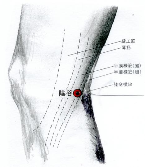(腎 経)膝裏内側横紋(しわ)上で、半腱様筋腱と半膜様筋腱の間にある