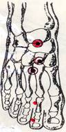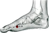 | 1-①太白 たいはく (脾 経)足の第1中足骨頭の 内側後縁、赤白肉際 または①-2.を採る |