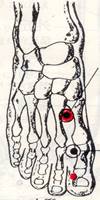 3- ①厲兌 れいだ(胃 経) 足の第2指の爪甲根部、中央で後方2ミリの点。 |